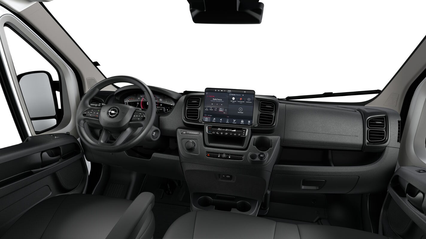 3 sæti að framan, fellanlegt miðjusæti með vinnuborði, grátt tauáklæði á sætum, ökumannssæti með armpúða og stillanlegum mjóbaksstuðningi, heilt þil milli ökumanns- og farþegarýmis, festilykkjur í farangursrýmiStjórntæki
